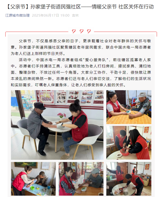 父親節,不僅是感恩父親的日子,更承載著社會對老年群體的關懷與敬意。孫家堡子街道民強社區聚焦轄區老年居民需求,聯合中國水電一局志愿者為老人們送上別樣的節日關懷。 活動中,中國水電一局志愿者組成"愛心服務隊",前往轄區孤寡老人家中。志愿者們手持清潔工具,認真細致地為老人打掃房間,擦拭家具、清掃地面、整理雜物,不放過任何一個角落。大家分工協作、干勁十足,很快就讓原本凌亂的房間煥然一新。志愿者們還與老人們親切交談,了解他們的生活狀況和實際需求,叮囑老人保重身體,讓老人們感受到親人般的關懷。 江源城市微治理,民強社區黨總支,民強社區三家公眾號進行了同步報道。 https://mp.weixin.qq.com/s/bDsMYi0P3SFxerszb2GmEg https://mp.weixin.qq.com/s/ISSVTr-27XxfWZiLmMSH2g https://mp.weixin.qq.com/s/HgV21UB936tRI9zjld8emw |