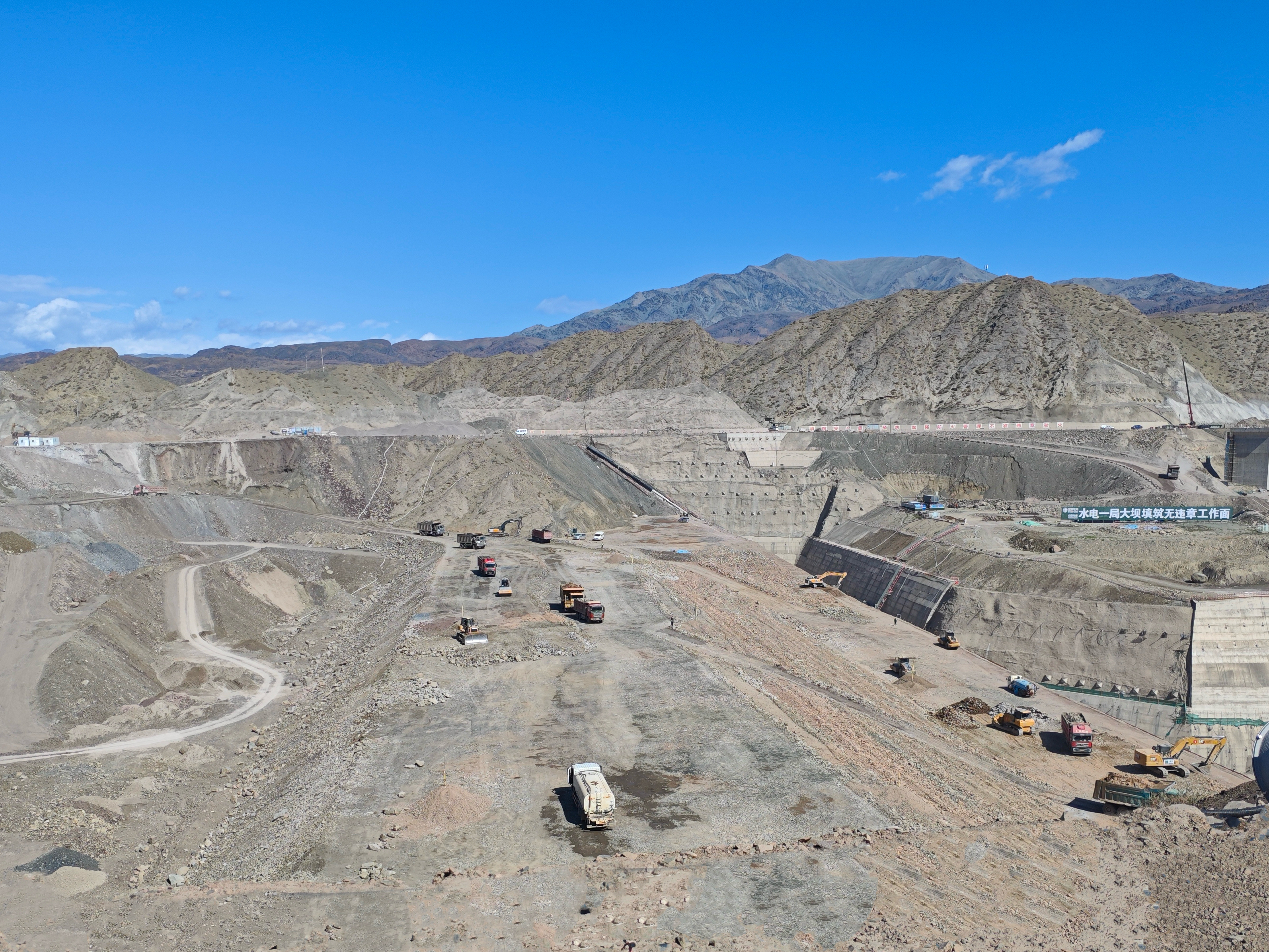 這片河谷曾是風與沙的領地,地質復雜、晝夜溫差大,給壩體填筑帶來重重考驗。為確保每一層土石方的壓實度達標,項目技術團隊創新采用“分層碾壓+實時監測”模式,白天頂著烈日優化攤鋪參數,夜晚借著燈光分析數據,硬是在堅硬的巖層上一點點“壘”起大壩的雛形。如今站在觀禮平臺俯瞰,壩體已如巨龍般橫亙河谷,初步顯露出“截斷天山云雨”的壯闊氣勢。